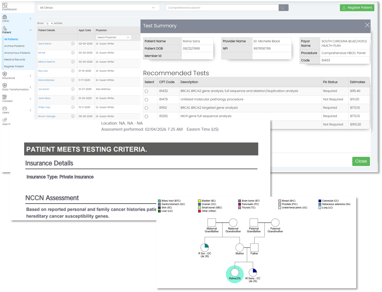 Ready-built, fully customizable module for automated risk assessment, AI-guided pre-test counseling, NCCN-compliant test ordering, and insurance verification—all in one platform.